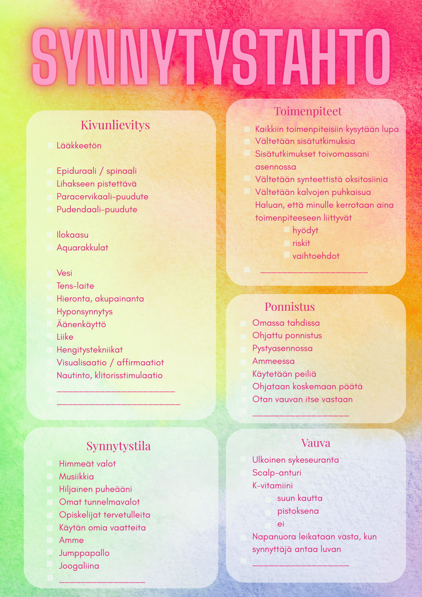 Tämän pohjan avulla tuot synnytystahtosi helposti kätilöiden ja lääkäreiden tietoon! Voit tulostaa pohjan ja käyttää sitä sellaisenaan, tai täydentää sen avulla omin sanoin kirjoittamaasi synnytystahtoa. Tämän rastitettavan synnytystahtopohjan kautta ammattilaiset voivat tarkastaa toiveesi ja tahtosi kiireenkin keskellä.